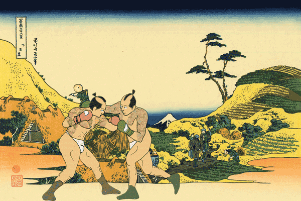 「相撲絵」は、江戸時代に描かれた浮世絵ですが、北斎に代表されるような「風景」の中に力士が描かれたものは多くありません。 イッツ・ア・スモウ・ワールド