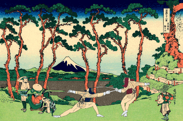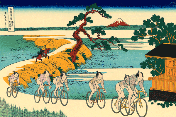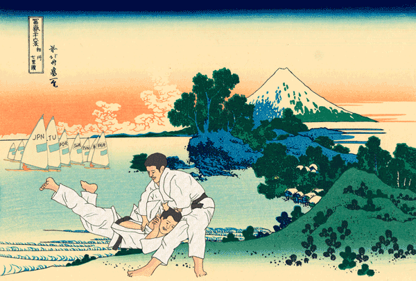 東京浮世絵コロシアムは、その「北斎浮世絵」と、オリンピック競技を組み合わせたコラージュ作品を制作しています。