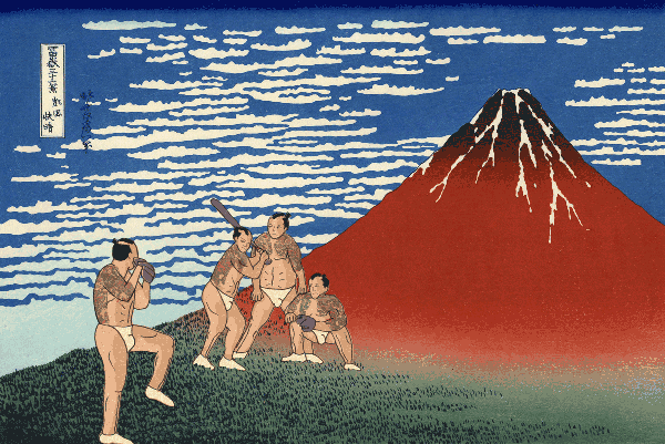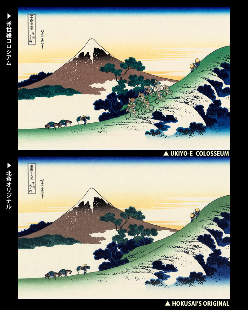 パッと見ると北斎の浮世絵に見えますが、よく見てみると、そこにはオリジナルキャラクターが本来の北斎の作品を邪魔することなく登場しています。 北斎のオリジナルとコラージュ作品の比較